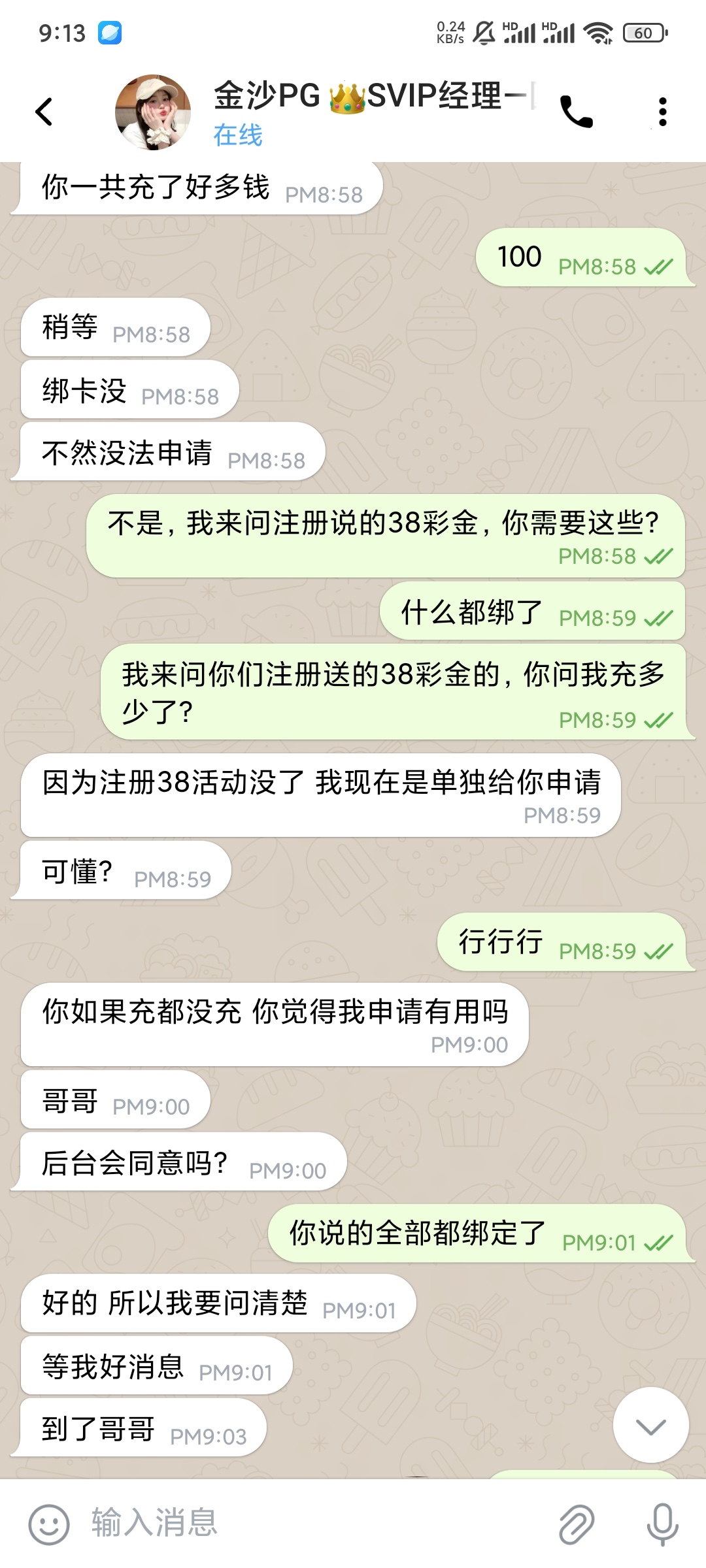 充值过的,上次傻逼蛋给的那个金沙PG娱乐城 38彩金的可以去领了,去找客服问,然后下载聊天软件问,他就另外帮你申请,不问的不会有了,他说已经那个活动已经没了,不过也没水,纯杀猪台,200进去300流水,38进去50流水
