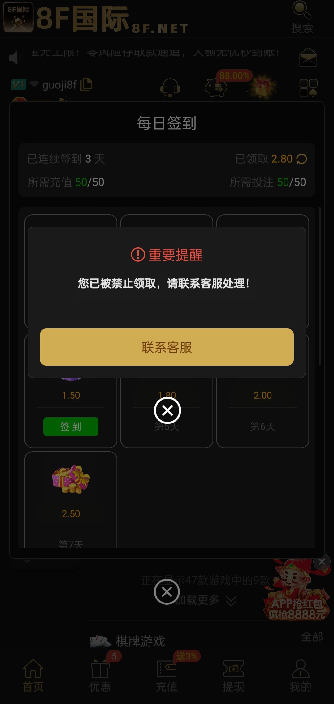 8f国际虽说提现到账了,但福利全被限制了,这不明显的杀不了的时候就先限制吗?