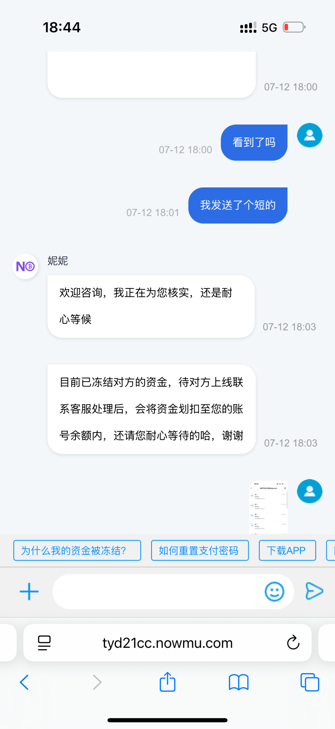 充值了一笔准备上传图片上传不了图片 然后找客服一直在排队前面30个人排到订单超时了客服也不回话后面对方直接把币又卖了 客服也是不回说话跟死人一样说的话前后不一一会说冻结了对方资金一会又说对方资金没了这不是傻逼吗 话也不说纯死人一个我用no用俩年了2000笔订单这傻逼平台
