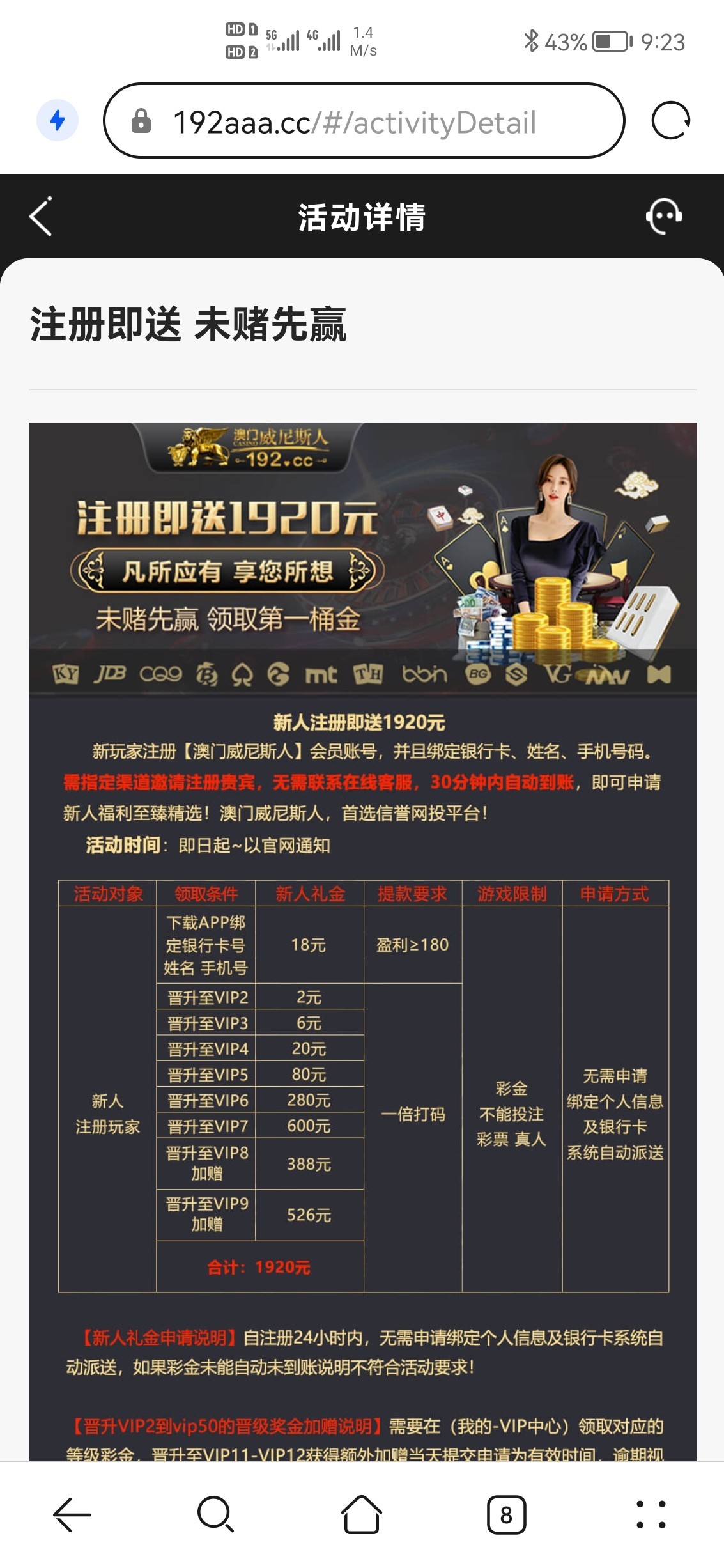 新用户先下载app再注册绑卡24小时以内自动赠送18彩金 游戏和提款限制自行查看优惠
