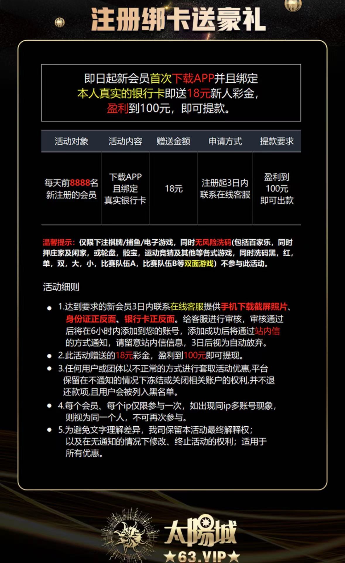 (每天限制8888名额 申请需要身份证和银行卡正反面 提供了必送介意的无视) 新用户注册绑卡下载app联系在线客服申请18元彩金 没名额了就晚上12点再去游戏和提款限制自行查看优惠