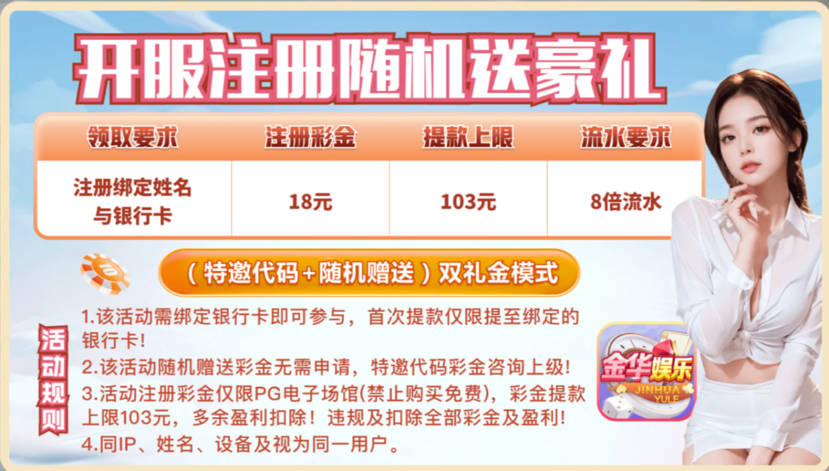 新用户注册随机赠送18元注册彩金,只能玩PG,最高提款103元,也有存送活动1+1 3+3 5+5四倍流水的,自己试试吧