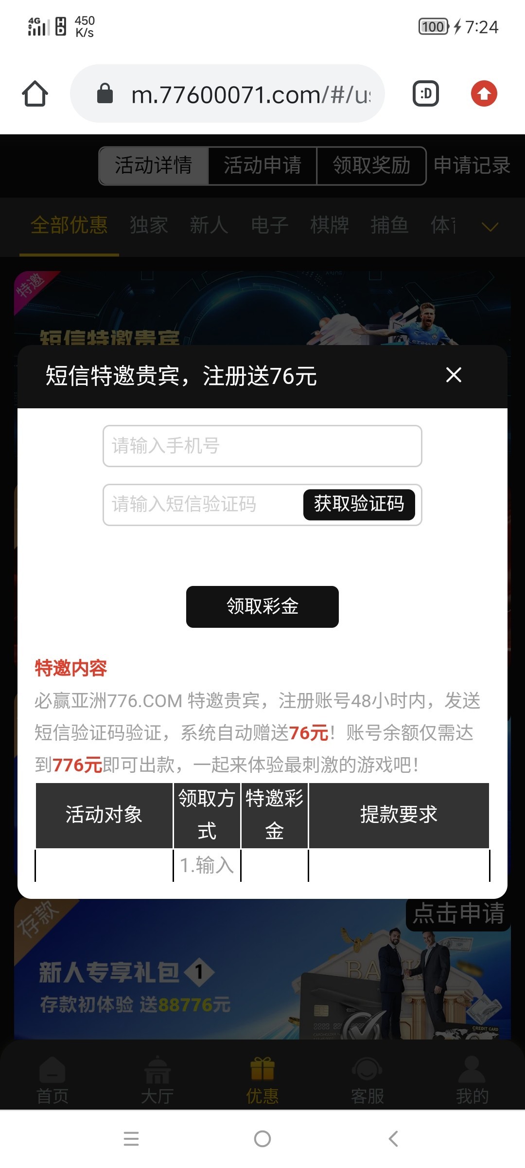 新用户注册绑卡,完善信息再下载APP。然后编辑短信发送账号申请76彩金,满760即可提现,详细看优惠活动,具体自测!